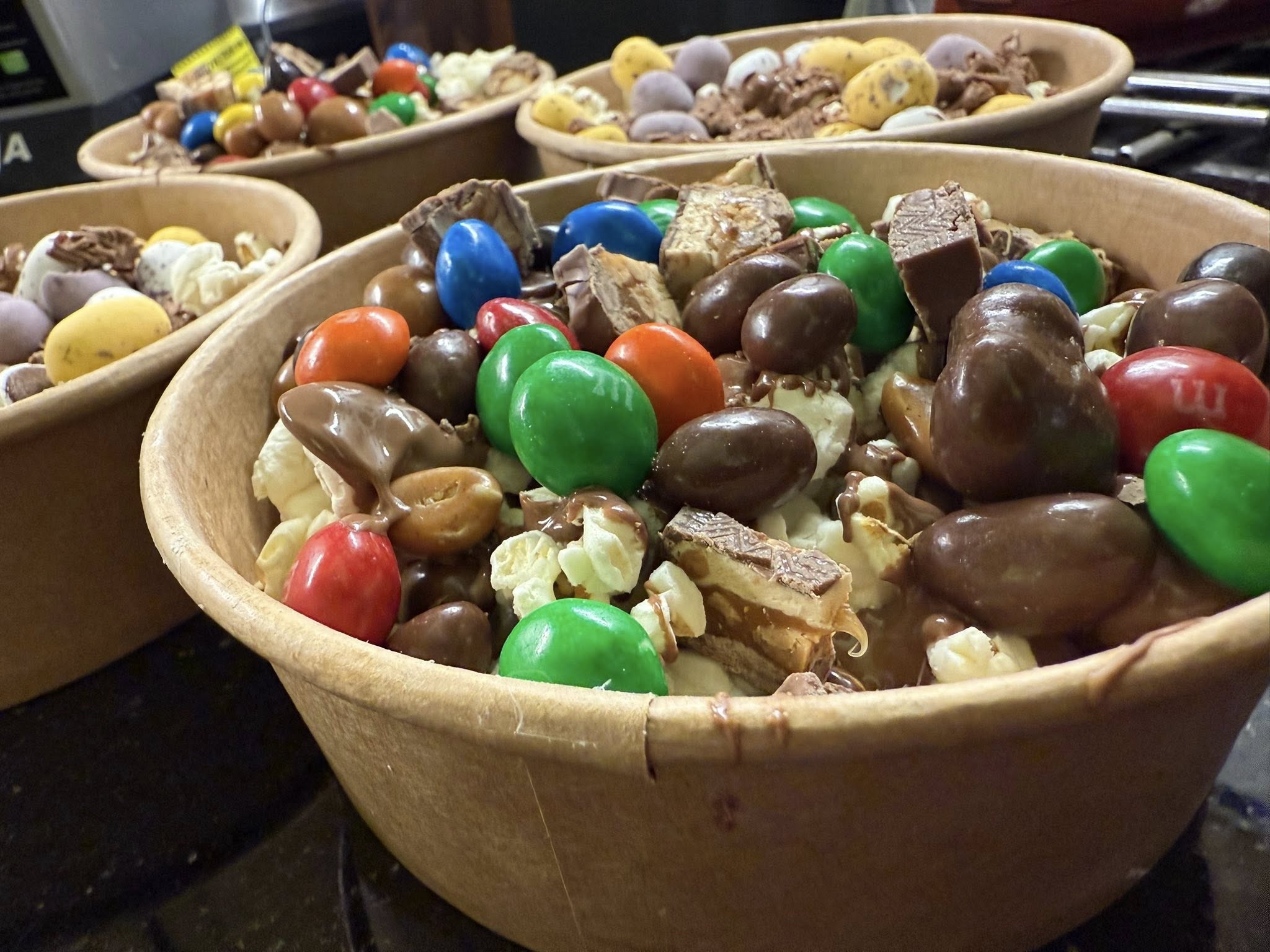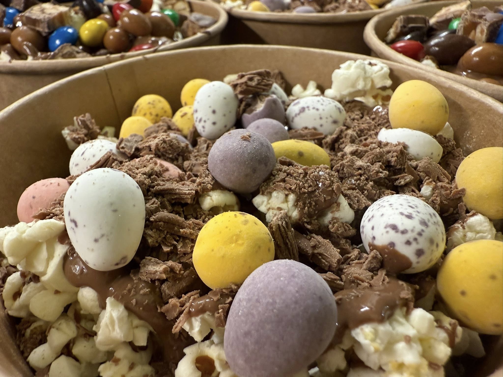 We’ve come back from Florida with new ideas and inspiration including popcorn sweet tubs including Cadburys mini eggs with flake crumbles and melted Cadburys chocolate or Peanut M & M’s, Reese’s dipped peanuts and snickers.