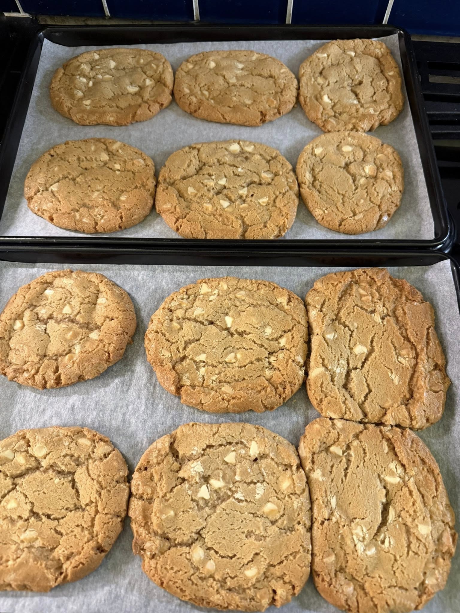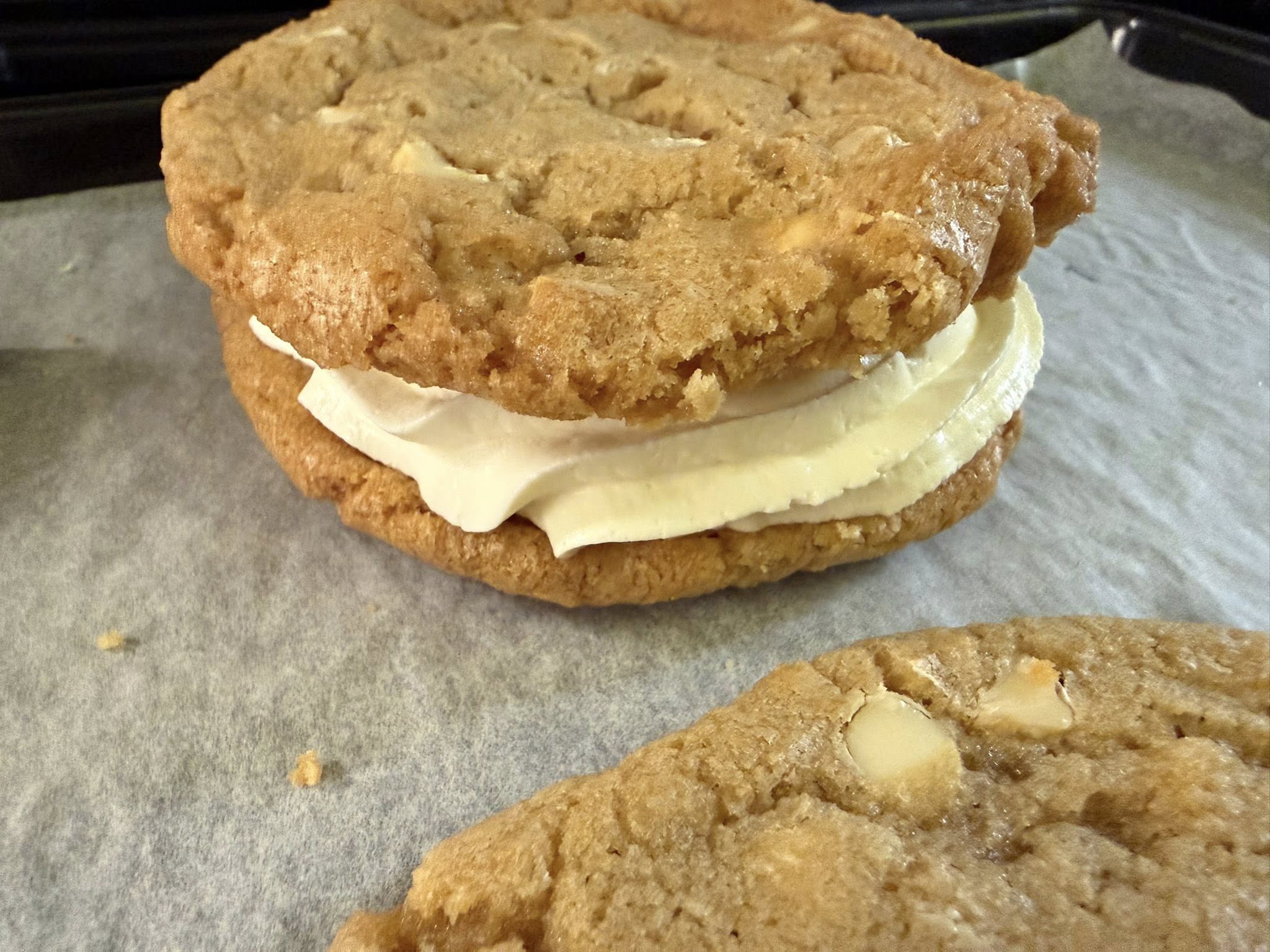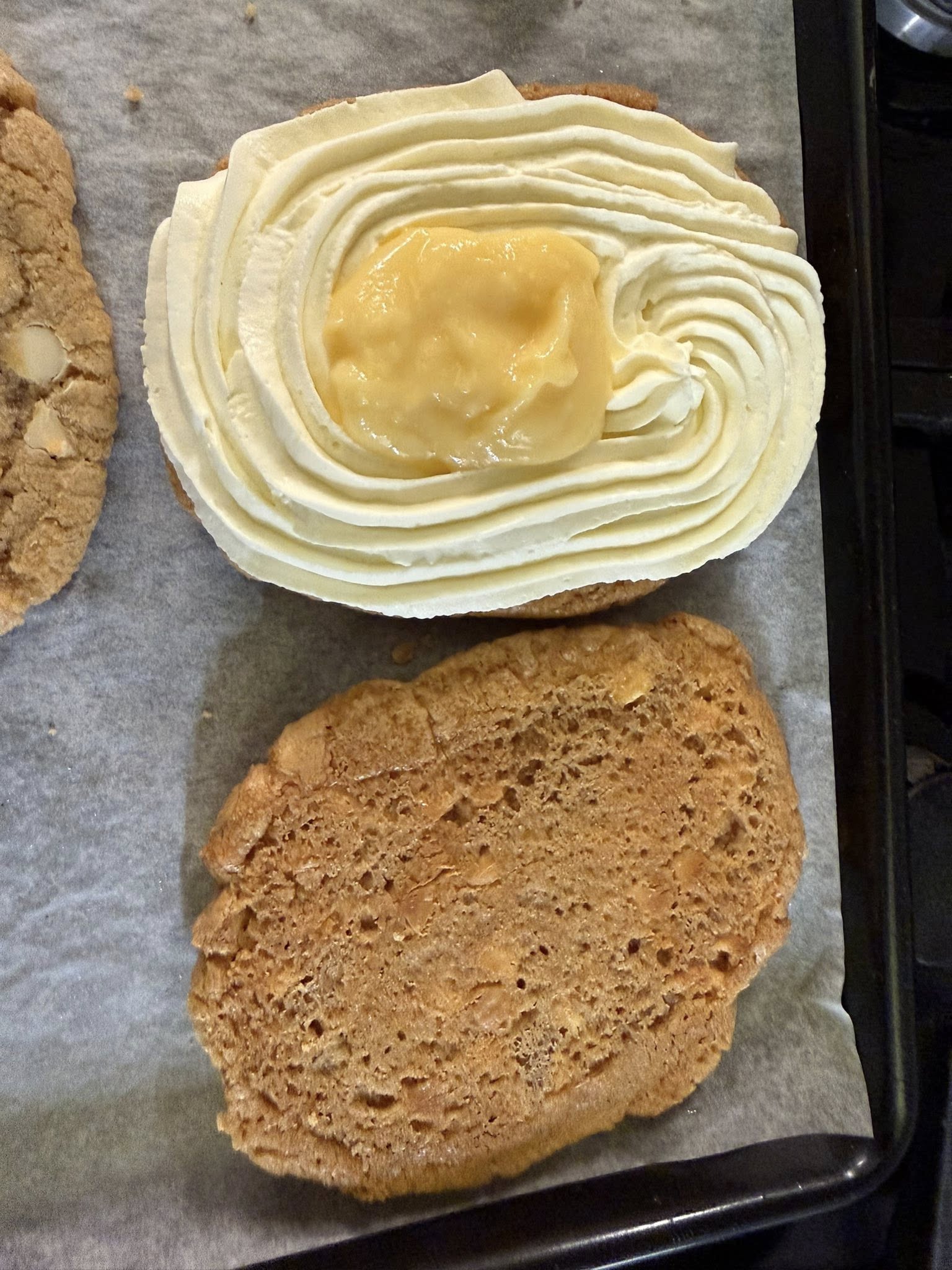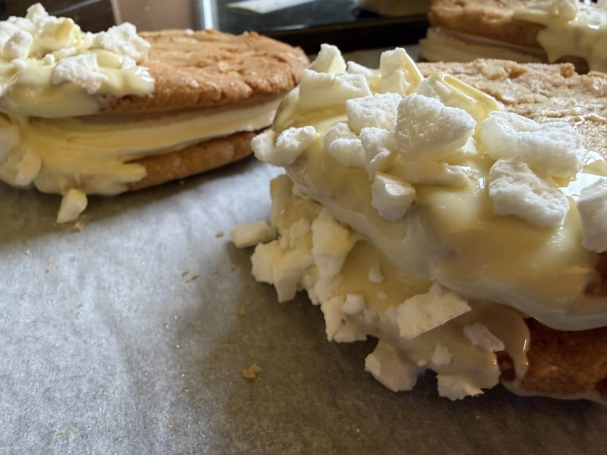 American Style white chocolate chip cookies sandwiched together with a filling of cheesecake and Hedge to Toast lemon curd then dipped in white chocolate and decorated with crushed meringue. £3.95